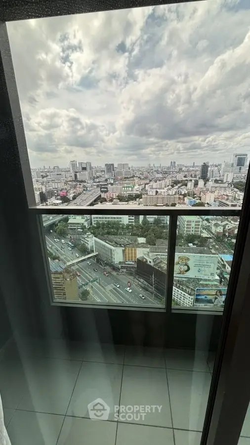 Stunning cityscape view from high-rise balcony with expansive skyline and bustling streets below.