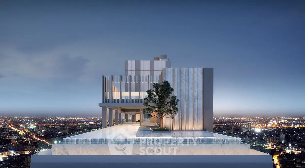 Luxurious rooftop pool with stunning city skyline view at sunset.