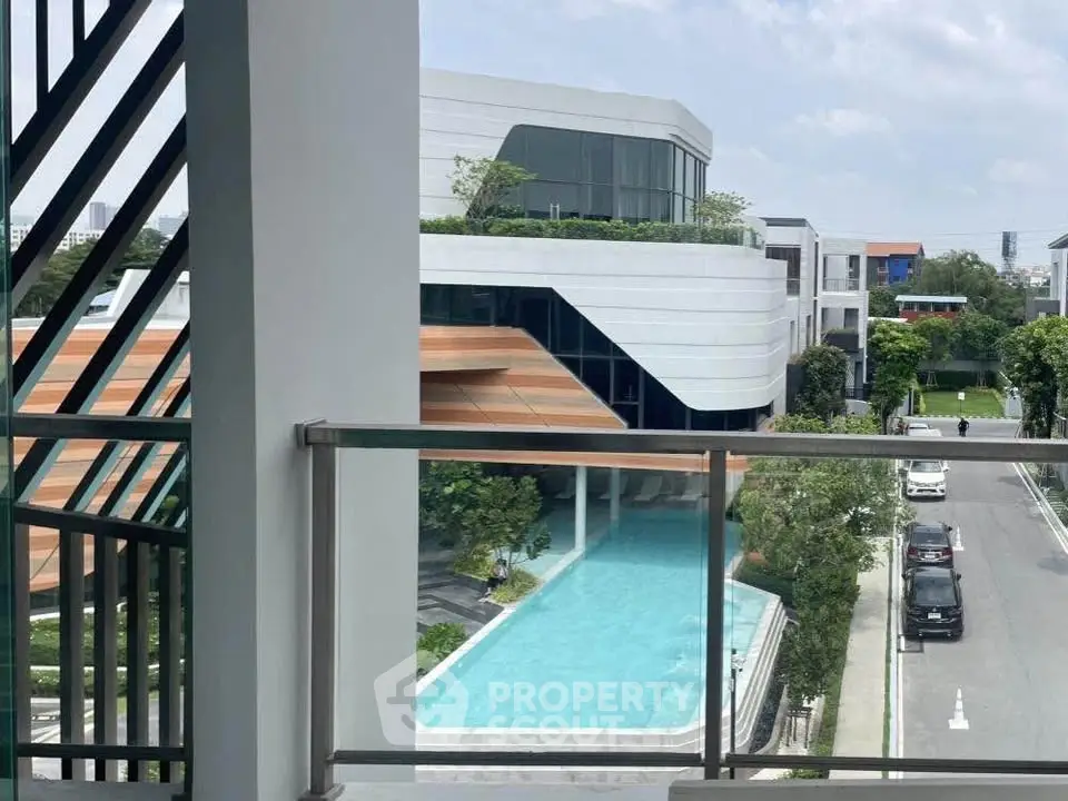 Modern building with pool view from balcony, showcasing sleek architecture and lush surroundings.
