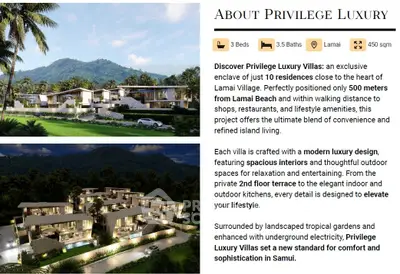 ขาย วิลล่า 3 ห้องนอน 4 ห้องน้ำ ขนาด 345 ตารางเมตร ซึ่งตั้งอยู่ในเขตเกาะสมุย ติดต่อเราเพื่อนัดหมายเข้าชมรายการที่คุณต้องการ