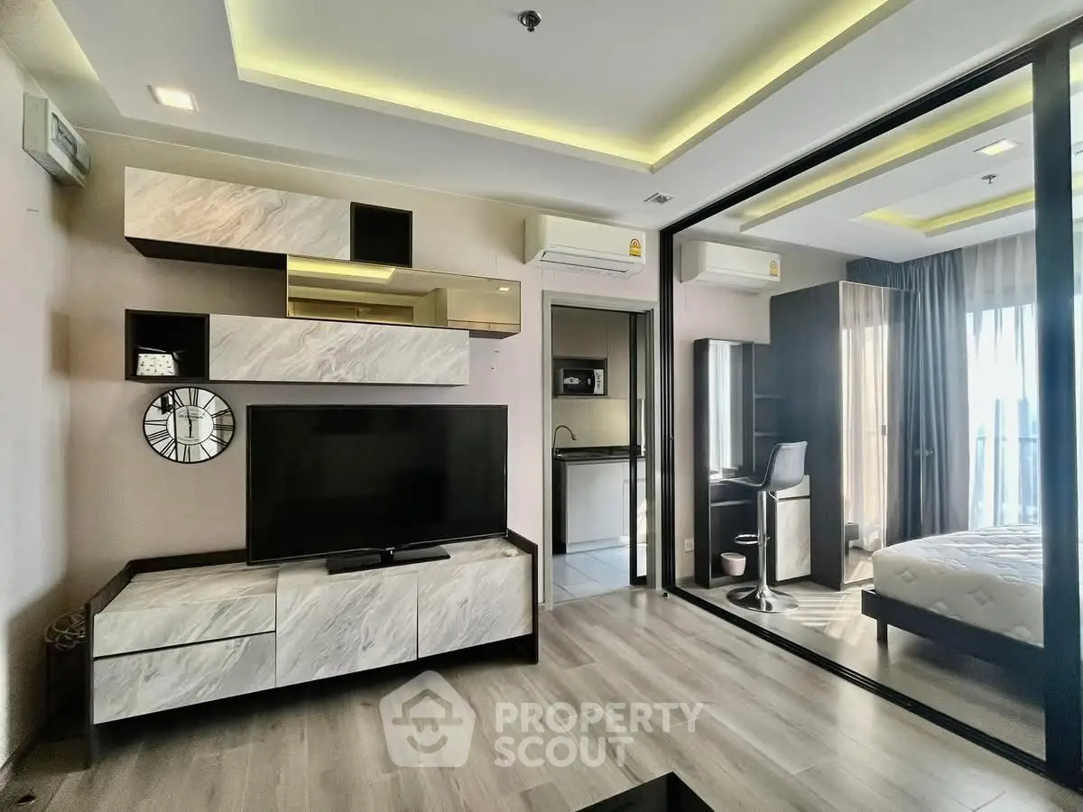 Fully furnished 1 bedroom, 1 bathroom condo for rent / sale with a floorsize of 31.45 squaremeters, located on the 25th floor, at Politan Rive building, in the popular Mueang Nonthaburi district near MRT Phra Nang Klao Bridge. Please contact us to schedule a viewing.