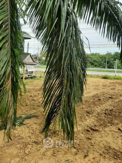 Spacious land plot with lush palm trees and a nearby house, ideal for development.