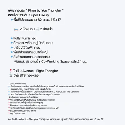 Fully furnished 2 bedrooms, 2 bathrooms condo for rent with a floorsize of 82 squaremeters, located on the 17th floor, at Khun By Yoo building, in the popular Watthana district near BTS Thong Lor. Please contact us to schedule a viewing.