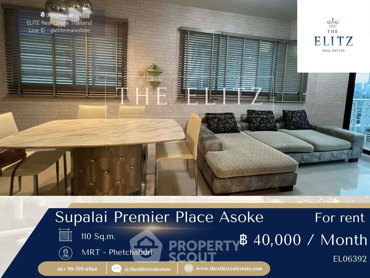 Fully furnished 2 bedrooms, 2 bathrooms condo for rent with a floorsize of 110 squaremeters, at Supalai Premier Place Asok building, in the popular Watthana district near BTS Asok, near MRT Phetchaburi and near ARL Makkasan. Please contact us to schedule a viewing.