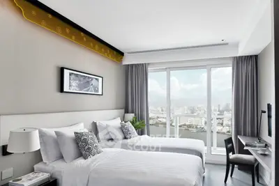 Cozy 2-bedroom 1-bathroom serviced apartment in the Khlong San district, close to BTS Saphan Taksin, perfect for an urban lifestyle.