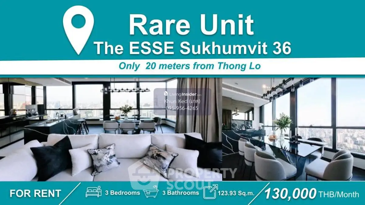Fully furnished 3 bedrooms, 3 bathrooms condo for rent with a floorsize of 123.93 squaremeters, at The Esse Sukhumvit 36 building, in the popular Khlong Toei district near BTS Thong Lor. Please contact us to schedule a viewing.