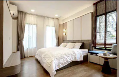 Fully furnished 4 bedrooms, 6 bathrooms house for rent with a floorsize of 302 squaremeters, at Nantawan Rama 9 - New Krungthep Kreetha project, in the popular Saphan Sung district. Please contact us to schedule a viewing.