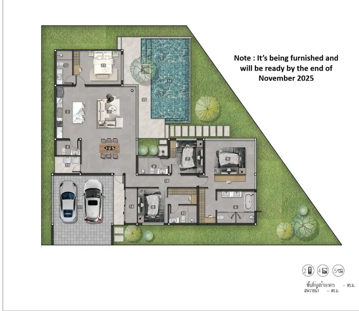 Fully furnished 4 bedrooms, 5 bathrooms villa for rent with a floorsize of 340 squaremeters, at Mouana Residence KO KAEO building, in the popular Mueang Phuket district. Please contact us to schedule a viewing.