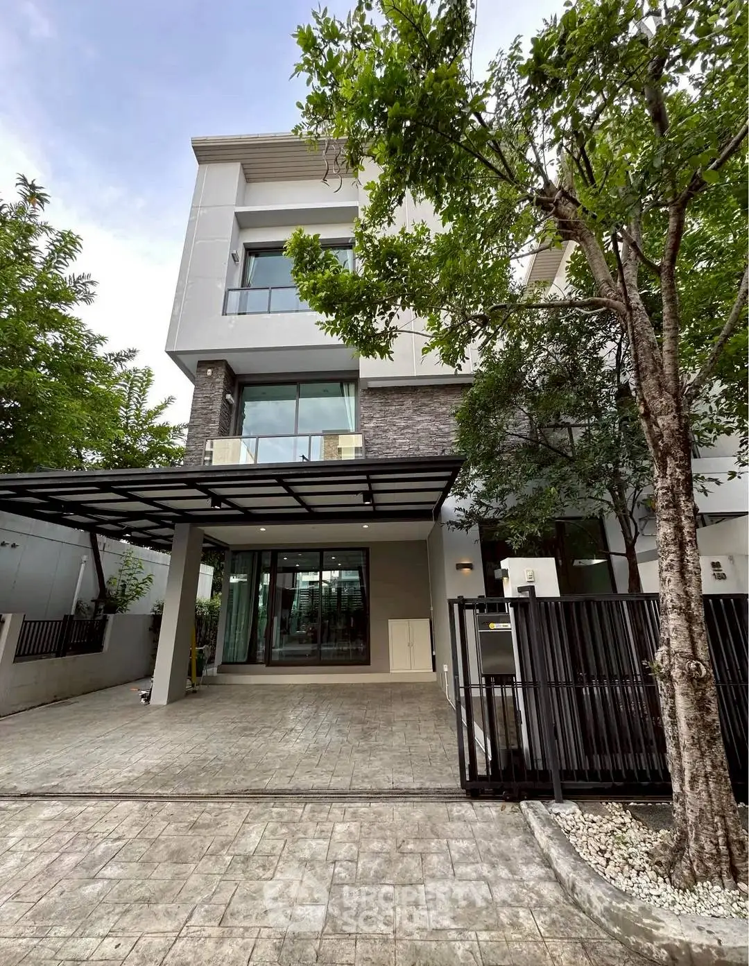 Modern three-story house with sleek design and large windows in a serene neighborhood.